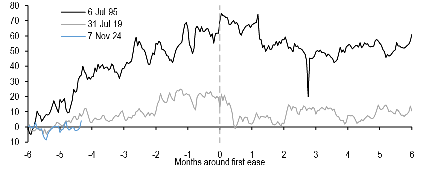 Meanwhile, markets are pricing roughly 140bp of easing over the next 18 months, slightly more than our own forecast ( Figure 3). Moreover, we recognize that the lack of clear economic vulnerabilities together with an uncertain inflation outlook may leave the upcoming easing cycle shallower than many prior cycles, perhaps more closely resembling the experiences of 1995 and 2019. However, even in those cycles, yields declined more than 125bp on average in the six months prior to the first cut. Thus, we believe there is still room for yields to decline ( Figure 4). Nonetheless, even though the onset of the easing cycle appears to be just a few months away, we will be patient in adding duration longs, given negative carry implications and outright valuations. Along the yield curve, we think long-end steepeners provide the best value as we approach the start of an easing cycle, especially as most curve pairs remain near their flattest levels of the last 3 years. We prefer 5s/30s steepeners: this curve displays a high sensitivity to medium-term Fed expectations, should benefit from rising term premium, and appears too flat versus our fair value framework (see Treasuries).