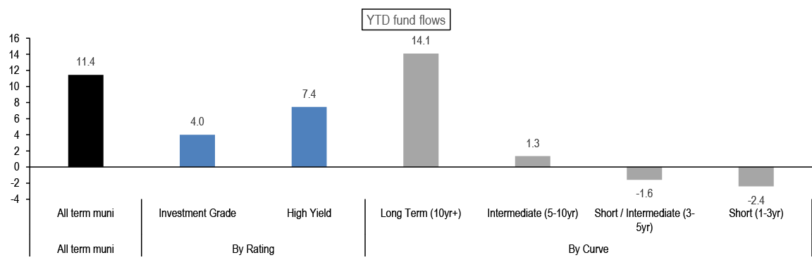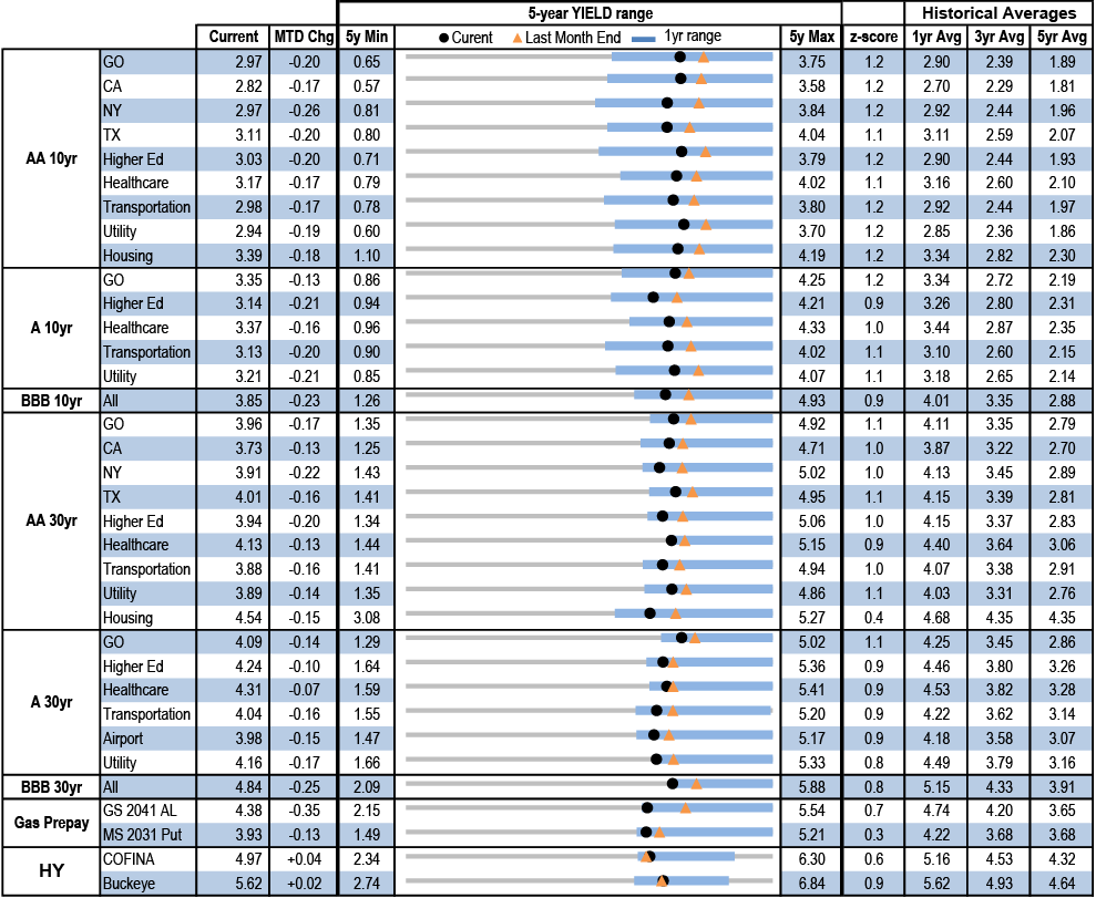 | 10-year muni yield (%) | 2.84 | 2.60 | Finding sustained market consensus while navigating transition to an easing cycle may be difficult, but we suggest playing the long game, and buying municipal bonds with a longer term perspective, particularly in periods where Treasuries sell-off. We suggest adding idiosyncratic municipal risk opportunistically on market weakness, and highlight potential market cheapening in the period before the election. |