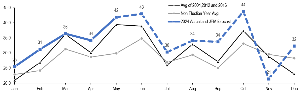 - Corporates: We look for HG spreads to stay tight, though we revise our YE24 HG bond spread forecast to 110bp from 95bp. 2H24 demand to be less strong with slower growth and election uncertainty. We also revise our gross issuance forecast up to $1.45tn