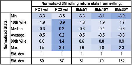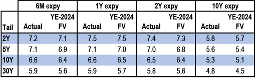 | 2-year SOFR swap spread (bp) | -14 | -6 | Swap curves should drift steeper in 2H24, but this is mostly priced into forwards except for curves anchored in the back end. Option-implied Fed expectations have coalesced around a moderate cutting path, which implies lesser jump risk and favors carry trades on the curve as well as short-gamma strategies. TFP is expected to drift higher - look for wider swap spreads in the front end, but long end spreads are likely to remain flat to current levels. We describe a new class of RV trades involving selling the volatility of the second principal component, which is likely to be attractive in coming months. |