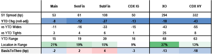| High Grade (bp) | 53 | 50 | We prefer our longs in Cash and shorts in Derivatives as the latter looks stretched. We are sticking with Decompression as Recession remains on the horizon and Rates volatility subdued. We use Credit options to buy cheap Rates optionality. We expect US indices to outperform. |