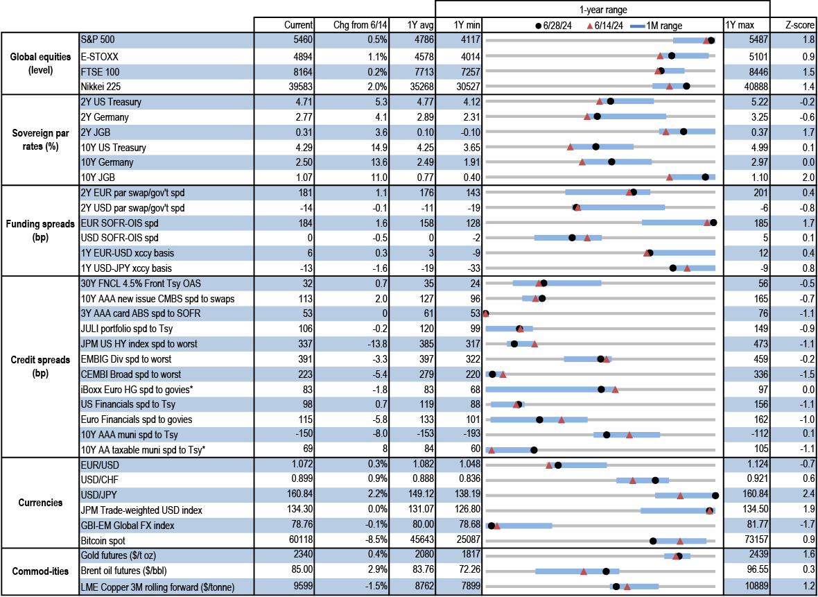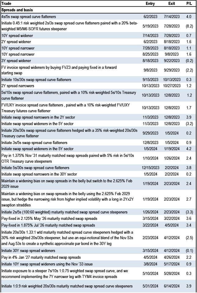 - Treasuries: We expect a rangebound environment for Treasury yields in the months ahead. Even shallow easing cycles support lower yields, but Fed pricing and carry implications make it challenging to be long duration. We continue to see value in 5s/30s steepeners. Remain bullish at the front end of the inflation curve. Though valuations have moved closer to fair, we expect a positive risk premium to emerge ahead of the US election