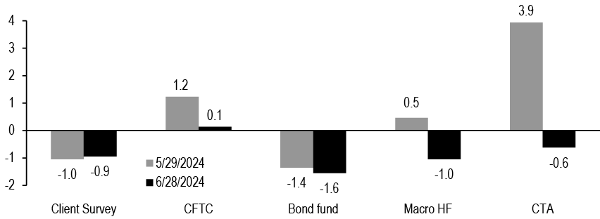 * JPM Client Survey refers to a 4-week moving average of our Treasury Client Survey Index; (Longs+Neutrals)/(Shorts+Neutrals), see Survey Says: Using the Treasury Client Survey to predict rates moves, 7/21/23for more details. CFTC refers to the non-commercial net longs in UST and SOFR futures contracts reported by the CFTC. CTA beta is the four-week partial beta of SG CTA Index to 10-year UST yields. Real money beta is the eight-week partial beta of excess returns of the 20 largest actively managed US core bond funds to 10-year UST yields. Macro HF beta is the six-week partial beta of HFRX Macro/CTA Index to 10-year UST yields