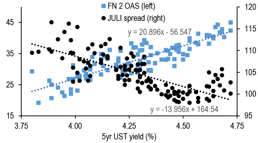| 10-year yield (%) | 4.34 | 4.40 | Maintain 5s/30s steepeners and 75:6 weighted 5s/10s/30s belly-cheapening butterflies to position for higher term premium |