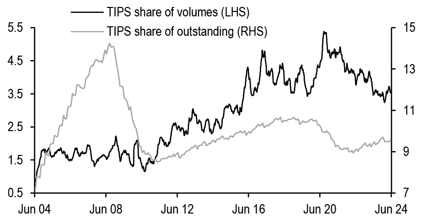 • TIPS daily trading volumes have averaged $18.5bn YTD, close to averages observed in recent years, with daily turnover of the market excluding Fed holdings remaining just above 1%. TIPS volumes as a share of overall Treasury volumes have declined from their post-COVID peak but remain elevated on a historical basis...