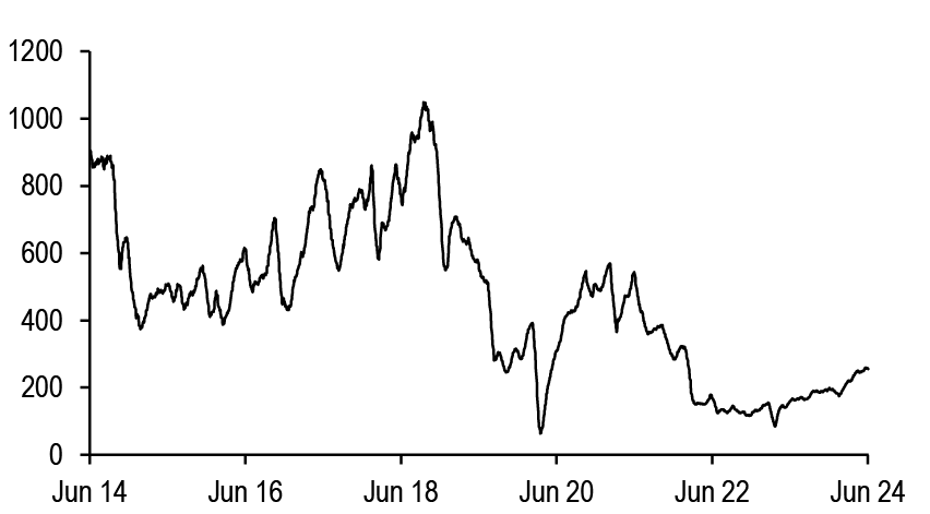 Overall, a host of Treasury market metrics indicate stable to improving liquidity conditions: trading volumes are rising, and turnover has stabilized at low levels. Meanwhile, market depth in nominals and TIPS has been on a rising trend, price impact has continued to decline, and the HFT share of depth provision has been stable as well. Meanwhile, dispersion has been on the rise, but we attribute much of this move to a select few deeply off-the-run bonds from the late-1990s and early-2000s, and moves look muted when excluding these CUSIPs. In contrast though, dealer inventories have been on the rise, and as a share of total Treasury debt outstanding, inventories are approaching levels reached in late-2019/early-2020. Overall, if volatility continues to decline, we think this bodes well for Treasury market liquidity conditions, but we do not expect a return to pre-pandemic levels. Of course, any exogenous shock would be a negative for liquidity conditions.