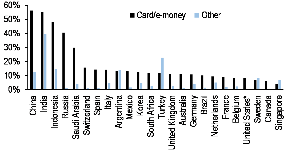 The global payments landscape is evolving, with new systems allowing near-instant person-to-person retail payments increasingly available around the world. Asia represents the bulk of global growth in payments, driven in large part by the explosion in third-party (non-bank) and especially mobile providers. The volume of cashless payments has risen sharply in recent years, especially in Emerging Markets. In China and India, for example, the volume of cashless payments increased more than five-fold over 2014 to 2018, while the volume of cashless payments in Russia has tripled. The IMF notes that the value of e-money transactions in China, such as with WeChat Pay and Alipay, surpass those worldwide of Visa and Mastercard combined.6 Among the various types of noncash payments, card and e-money payments have grown faster. However, we note that despite the rise of cashless payments, cash use is still increasing in most countries. Indeed, only China, Korea, Singapore, Turkey, Indonesia, India, and the US (assuming 2017 numbers)—seven countries in total—have seen an increase in the value of cashless payments per inhabitant over the 2014-2018 time period (Harano).
