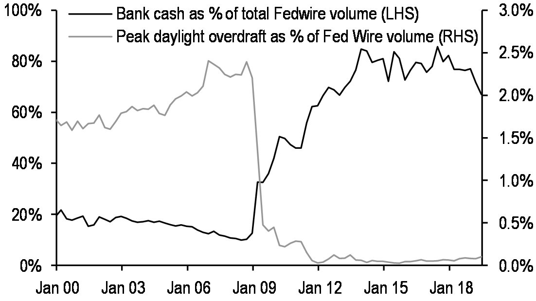 As Bitcoin and other freely floating cryptocurrencies continue to exhibit extreme volatility relative to fiat currencies, there has been much greater focus on stablecoins designed to minimize these price fluctuations. Younger et al. provide a primer on stablecoins and discuss key stability risks introduced by some designs. First, they argue that high-turnover payment systems require short-term liquidity facilities, particularly daylight overdraft provided by a non-economic central authority, to avoid gridlock—especially under stress. Second, the underbanked populations likely make up a small fraction of global payments volume, even after folding in the shadow economy. This means a world in which Libra or another stablecoin is successful is one in which its activity is dominated by developed markets—and by extension business-to-business (B2B) transactions with their associated reliance on intraday liquidity. Third, any system that relies on reserve asset income to fund operational and other ongoing costs becomes unstable in a negative yield world.