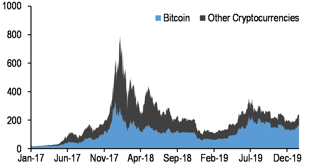 The market capitalization of cryptocurrencies recovered from around $125bn a year ago to around $235bn, with Bitcoin increasing its dominance by accounting for nearly two-thirds of the total. Once ‘fake’ trading volumes such as wash trades are adjusted for, participation by institutional investors is now significant. In addition, the crypto market continues to mature with the introduction of new contracts on regulated exchanges, most recently with the launch of options on futures contracts in regulated exchanges.