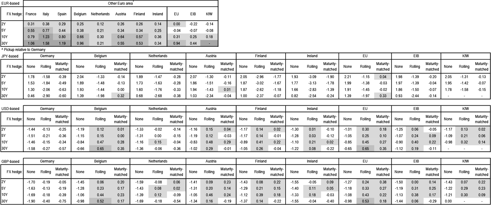 Annualised yield pick-up* for euro-, yen-, US dollar- and sterling-based investors from different Euro-based bonds of the same maturity, with no hedge, 3M rolling** and maturity-matched*** currency hedges; shaded regions for rolling and maturity-matched hedges show >1% yield pick-up (darkest shading), between 0.5% and 1%, and between 0% and 0.5% (lightest shading), %