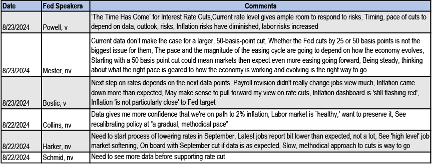 Instead, market participants were focused on Fed communications, which laid the ground work for an upcoming easing cycle. Even before the release of the July payrolls report, the July FOMC minutes revealed that “the vast majority” of the FOMC were ready to cut by the September meeting. Notably “many” participants noted the risks around cutting too little or too late while only “several” thought reducing rates too soon or too much could risk a resurgence in inflation (see July FOMC minutes highlighted labor market risks, Abiel Reinhart). Meanwhile this week Fed speak offered support for a “gradual” or “methodical” pace of cuts. However markets were most keen for Chair Powell’s Friday Jackson Hole speech where his comments skewed dovish. The Chair stated “the time has come” to adjust interest rates and that the Committee does “not seek or welcome further cooling in labor market conditions.” Unsurprisingly, our monetary policy NLP read Powell’s speech as more dovish than his press conference at the July FOMC meeting, and his most dovish speech since the fall of 2021 ( Figure 1, also see Fed, Powell: Review and Outlook, Joseph Lupton, 8/23/24). Whether the FOMC cuts 25bps or 50bps at the September meeting still hinges on the next monthly employment report, though Powell’s comments arguably lower the bar for the Fed to deliver a 50bp cut next month (see Cuts are coming, Michael Feroli, 8/23/24).