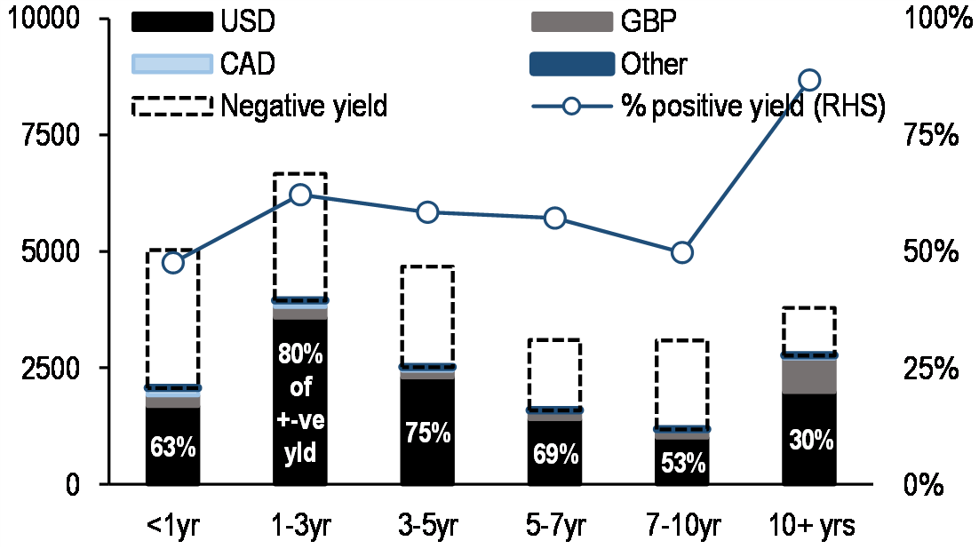 Younger et al. also examine the scalability of Libra and other stablecoins, particularly those backed by assets. They believe that the world is ready for private money, as most of the money in the world already comes from private issuers. However, private stablecoins are likely to face technical hurdles, including the need for intraday liquidity. If the experience of traditional banks is any guide, the institutionalization of stablecoins will come with significant regulatory oversight and costly compliance obligations. Second, they argue that given that DLT protocols are very energy intensive, less distributed, semi-private networks likely will be required. Third, they note that sourcing positive-yielding collateral may be difficult since a significant fraction of short-term high-quality sovereign debt is locked up in central bank balance sheets. The rise in negative-yielding debt poses a significant challenge to Libra and other fiat-backed stablecoins. While global financial markets are awash in high quality short-term government debt suitable as stablecoin collateral, only half offer positive returns. In our most recent J.P. Morgan Perspectives publication, What if US yields go to zero?, 16 January 2020, we outline why the persistence of very low nominal policy rates is here to stay.