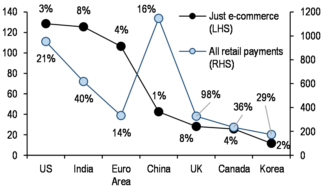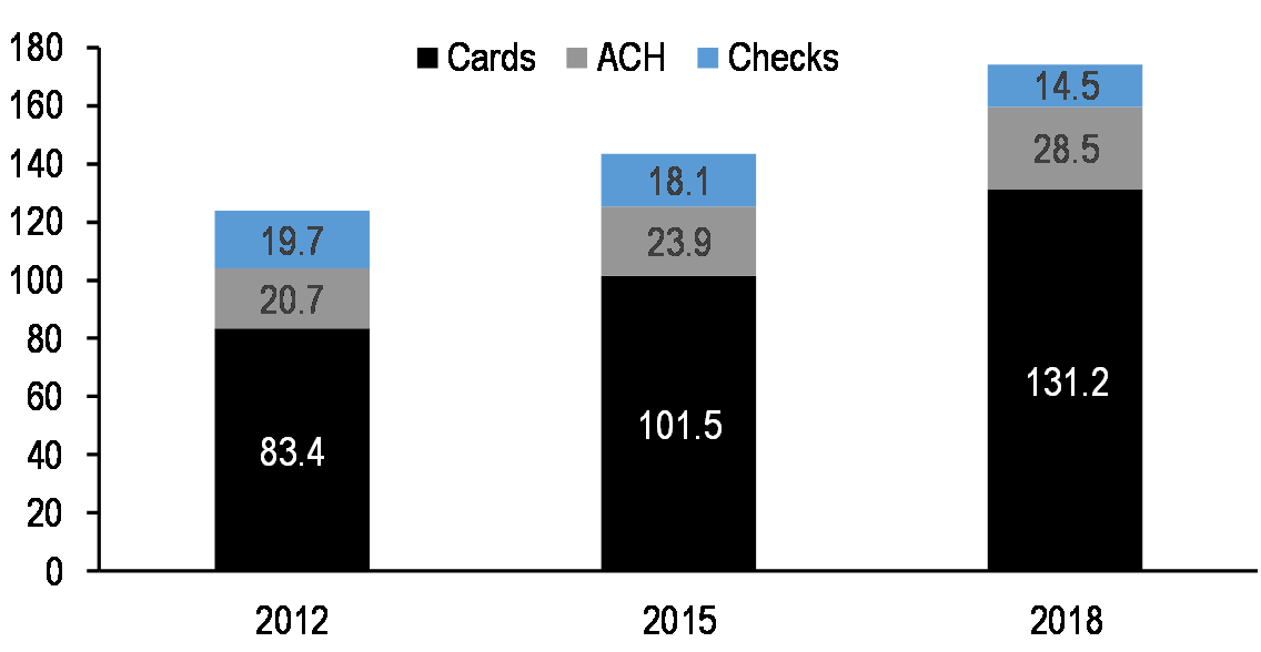 The global payments landscape is evolving, with new systems allowing near-instant person-to-person retail payments increasingly available around the world. Asia represents the bulk of global growth in payments, driven in large part by the explosion in third-party (non-bank) and especially mobile providers. The volume of cashless payments has risen sharply in recent years, especially in Emerging Markets. In China and India, for example, the volume of cashless payments increased more than five-fold over 2014 to 2018, while the volume of cashless payments in Russia has tripled. The IMF notes that the value of e-money transactions in China, such as with WeChat Pay and Alipay, surpass those worldwide of Visa and Mastercard combined.6 Among the various types of noncash payments, card and e-money payments have grown faster. However, we note that despite the rise of cashless payments, cash use is still increasing in most countries. Indeed, only China, Korea, Singapore, Turkey, Indonesia, India, and the US (assuming 2017 numbers)—seven countries in total—have seen an increase in the value of cashless payments per inhabitant over the 2014-2018 time period (Harano).