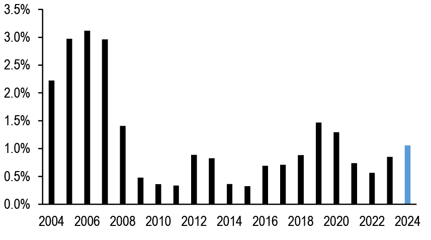 Overall, we find that broad measures of liquidity have been on an improving trend through 2024, supported by declining delivered volatility amid one of the longer Fed-on-hold periods in modern history. We also find that dispersion in off-the-run Treasuries has increased, but some of the recent concerns have been exaggerated by the presence of very small and highly illiquid bonds issued in the late-1990s. We also find little evidence of increased liquidity preference. However, it is notable that dealer positions, while still low compared to pre-GFC trends, have made new highs recently, approaching a share of total marketable debt outstanding that persisted just prior to the outbreak of the COVID-19 pandemic.