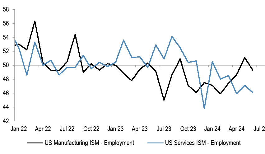 Business surveys have also been pointing to a softening labour market. The employment component of ISM Manufacturing was holding up so far but weakened in the the month of June, and Services employment is downshifting.