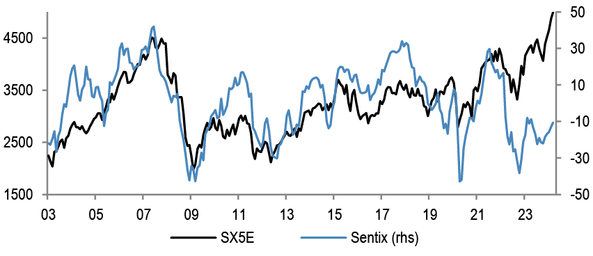 The rebound in Eurozone CESIs at the start of last year helped the equity market outperformance, while the weakness post May has been a drag. We note that Eurozone CESI appears to be moving above the US again.