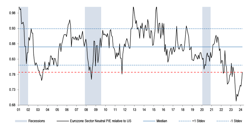 Eurozone is trading at sector neutral P/E discount to the US that is at past pre-COVID extremes