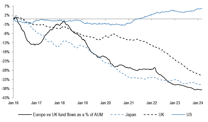 Apart from the renewed underperformance in the past few quarters, Eurozone equities have seen meaningful outflows, which contrasts to the US inflows.