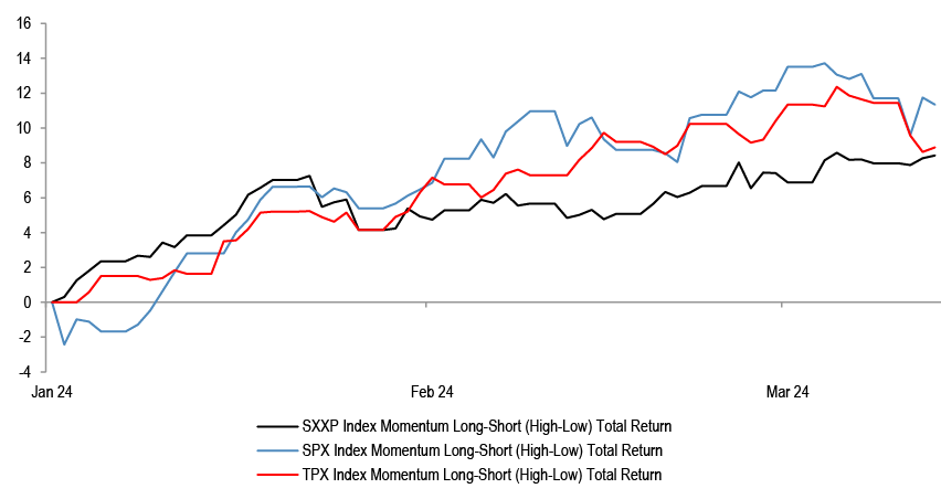 We fundamentally stay with the Growth over Value preference, but note the risk of a reversal is increasing, as the momentum trade has been very strong. The long momentum basket is outperforming the short leg by over 11% in the US, by 8.4% Eurozone, and by 8.9% in Japan.