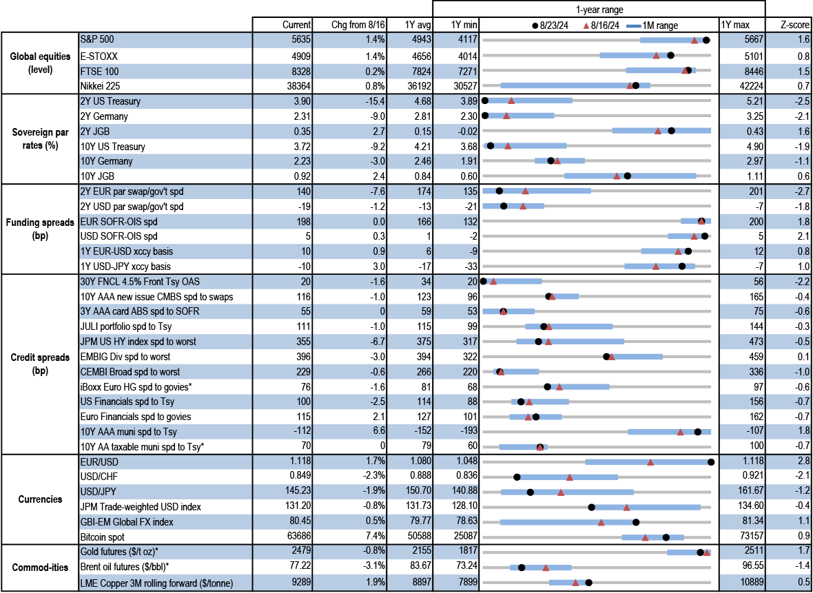 Over the past week Treasury yields are lower and spreads roughly stable across both corporate and mortgage markets as the economic data continue to reinforce only gradual cooling in the economy, the issuance calendar remains light, and Fed communications confirm expectations of a rate cutting cycle beginning in September. Indeed there was little fanfare from what sparse data was released this week. The preliminary benchmark revisions lowered total payroll employment growth for the year through March 2024 by 818k (0.5%), decreasing job growth by about 70k/month to a ~175k monthly run rate over the period. It is difficult to say exactly how the Fed will interpret this data, given that the revision cuts off in March 2024 and the implications for more recent months are not fully clear (see US: Benchmark brings big downward revision to (lagged) jobs, Abiel Reinhart, 8/21/24). At the same time initial jobless claims for the August employment reference week remained roughly unchanged over the week at 232k, but are 13k lower than the July reference week, and claims continue to follow a similar summer seasonal path as the last few years (see US: Good news from mostly stable jobless claims, Abiel Reinhart). The data support our view that the economy is slowing with low risks of a recession.