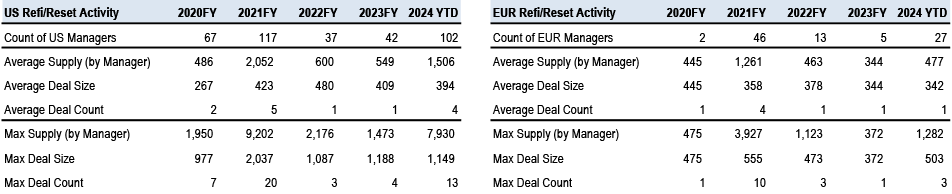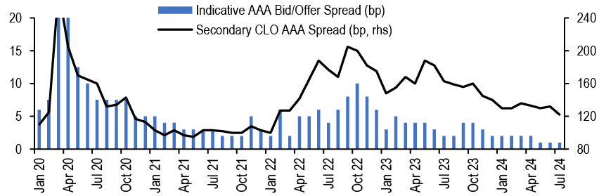 US CLO Primary AAA (Tier 1, bp) 135 SOFR + 150 We widened our base case CLO T1 AAA new issue spread forecast to 150bp (from 130bp prior) and introduced a 175-200bp risk case in the event of a hard landing.