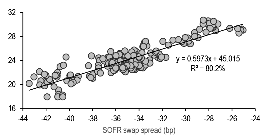 Turning to inflation markets, intermediate breakevens remain cheap to our fair value framework, though the model residual narrowed on Friday, given a dovish shift from Fed Chair Powell. In recent months, the Fed’s wavering confidence in disinflation and thus a heightened focus on labor market data created a less supportive backdrop for TIPS, with real yields demonstrating lower sensitivity to nominal yields in rallies than in sell-offs. However, we argue that the backdrop is becoming more supportive for TIPS once again. Along the curve, the intermediate sector continues to offer value, and forward-starting swaps avoid the negative carry associated with spot breakeven positions. With the fundamental backdrop turning more supportive and valuations still cheap, albeit somewhat less cheap than a week ago, we maintain tactical long exposure in 5Yx5Y inflation swaps (see TIPS).