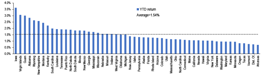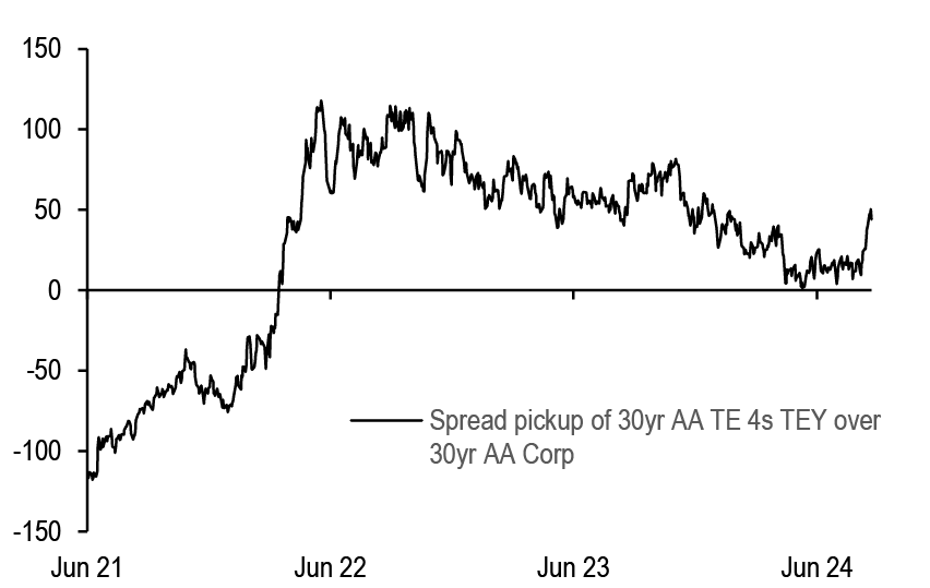 10-year muni yield (%) 2.69 2.10 Finding sustained market consensus while navigating transition to an easing cycle may be difficult, but we suggest playing the long game, and buying municipal bonds with a longer term perspective, particularly in periods where Treasuries sell-off. We suggest adding idiosyncratic municipal risk opportunistically on market weakness, and highlight potential market cheapening in the period before the election.