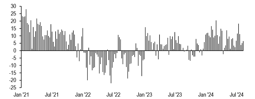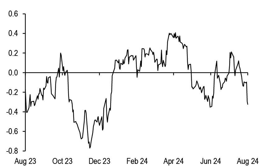 Instead, market participants were focused on Fed communications, which laid the ground work for an upcoming easing cycle. Even before the release of the July payrolls report, the July FOMC minutes revealed that “the vast majority” of the FOMC were ready to cut by the September meeting. Notably “many” participants noted the risks around cutting too little or too late while only “several” thought reducing rates too soon or too much could risk a resurgence in inflation (see July FOMC minutes highlighted labor market risks, Abiel Reinhart). Meanwhile this week Fed speak offered support for a “gradual” or “methodical” pace of cuts. However markets were most keen for Chair Powell’s Friday Jackson Hole speech where his comments skewed dovish. The Chair stated “the time has come” to adjust interest rates and that the Committee does “not seek or welcome further cooling in labor market conditions.” Unsurprisingly, our monetary policy NLP read Powell’s speech as more dovish than his press conference at the July FOMC meeting, and his most dovish speech since the fall of 2021 ( Figure 1, also see Fed, Powell: Review and Outlook, Joseph Lupton, 8/23/24). Whether the FOMC cuts 25bps or 50bps at the September meeting still hinges on the next monthly employment report, though Powell’s comments arguably lower the bar for the Fed to deliver a 50bp cut next month (see Cuts are coming, Michael Feroli, 8/23/24).