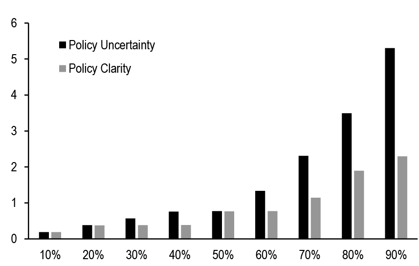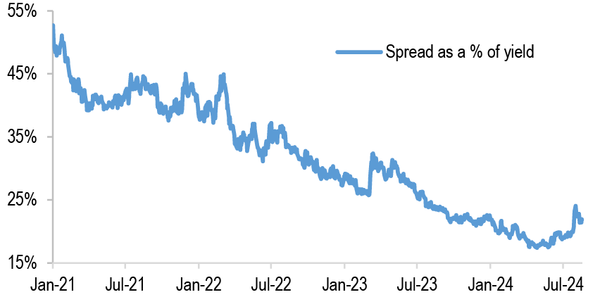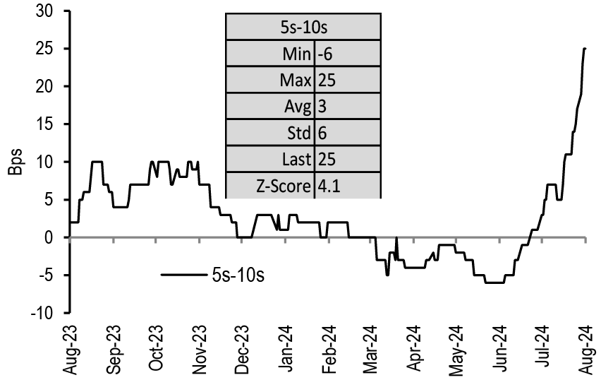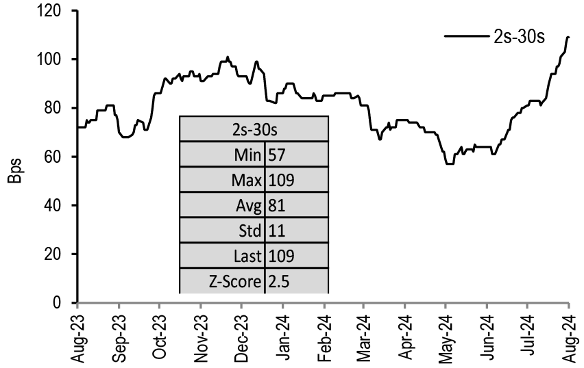Despite the near certainty of a cut in September, the pace and extent of easing remain uncertain with OIS markets placing significant weight on both deep cut and shallow cut scenarios. In this period of elevated policy uncertainty, yields should remain highly sensitive to both new economic and policy information; Figure 2 shows the percentile moves in yields around Fedspeak events and indicates that markets are prone to greater sensitivity during periods of elevated policy uncertainty. Such a backdrop is conducive to jump risk and supportive of elevated realized volatility. Thus with significant jump risk going into August payrolls and beyond, we remain bullish on volatility in short expiries. We also remain positioned for a flattening in the swap spread curve. Front-end spreads should be biased wider as SOFR and GC rates normalize and net T-bill supply turns negative in September whereas long-end spreads should narrow against the backdrop of rising term premium. Therefore, we now recommend initiating exposure to a flatter 5s/30s swap spread curve (see Interest rate derivatives).