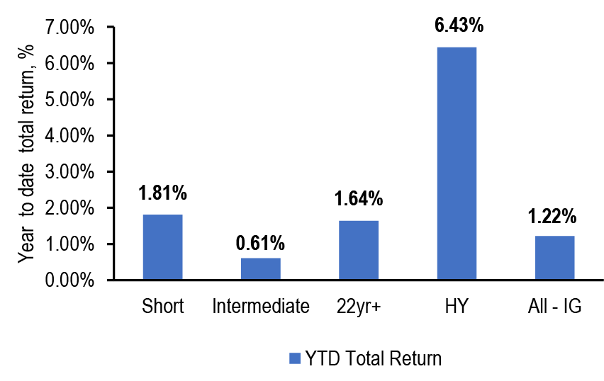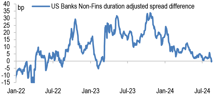 JULI spread to Treasuries (bp) 110 110 Still attractive yields, a continuation of positive returns, relatively lighter supply in the coming months and the start of Fed cuts will be supportive of spreads, while slower growth and a trend towards lower yields limits meaningful further spread tightening.