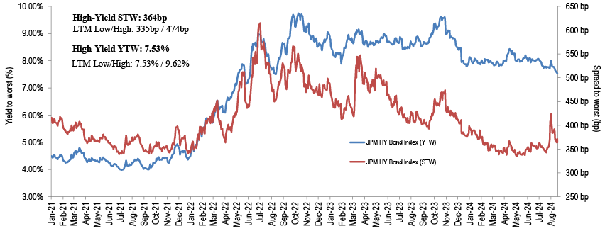 Domestic HY Index spread to worst (bp) 363 380 We believe HY spreads will be supported in the near-term by resilient earnings, steady inflows, and lighter capital market activity in 3Q