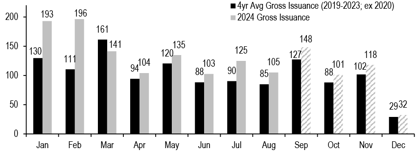 Treasury yields are lower and spreads stable as the economic data support a gradual economic cooling and as Fed communications confirm expectations of a near-term rate easing cycle. We continue to look for a 50bp cut at the next FOMC meeting and the August employment report will be key for determining the pace of easing. We modestly revise higher our HG gross issuance forecast to $1.5tn for 2024, leaving $400bn of issuance left this year.