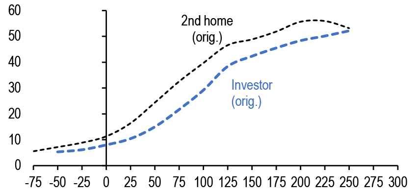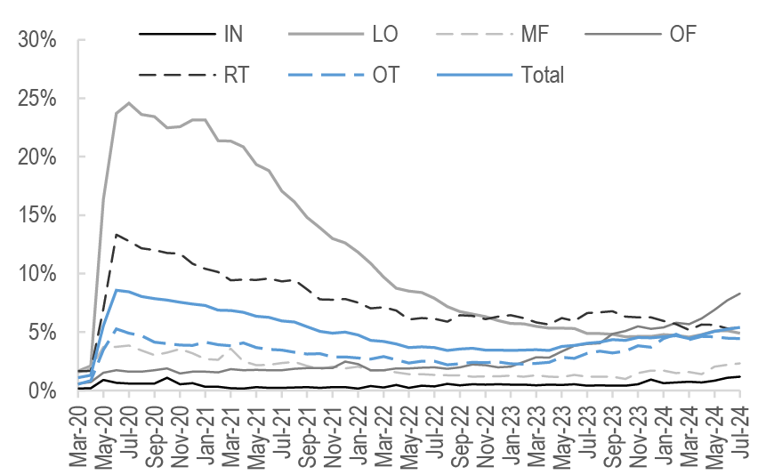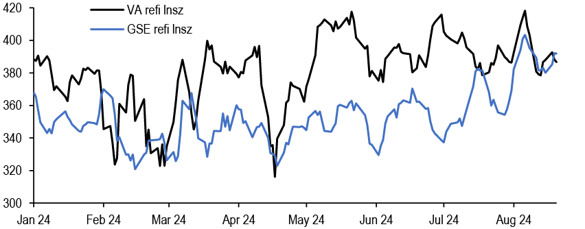 Mortgage rates are roughly unchanged across the stack, with lower coupons modestly tighter. Along with most spread products, valuations have recovered from the local wides seen early in the month; still, with mortgages continuing to offer historically compelling yields vs. corporates, we think the technical support for the product from money managers can be maintained. We continue to prefer UIC conventionals and are underweight 4.5s and 5s. Primary rates have fallen to roughly 6.44% on GSE loans and 5.47% for VA IRRRLs, but we have not seen a surge in refi applications, likely as originators picked up some low hanging fruit earlier this month ( Figure 4, see Mortgages). Mortgage credit spreads similarly retraced much of the widening seen earlier in the month with AAA non-QM back to 130bp in new issue. We expect spreads to remain rangebound over the rest of the year as the macro outlook remains challenging while the election season quickly approaches. Primary activity has been very active this summer, but stepped down over the month from $12bn to $7bn new issue RMBS in August, and we think primary markets will be light in the next week (see RMBS).