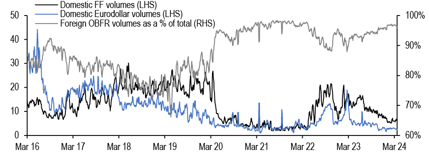 Fed funds and Eurodollar deposits (OBFR-FF) volumes (LHS, $bn) versus Foreign OBFR volumes as a % of total (RHS,%)
