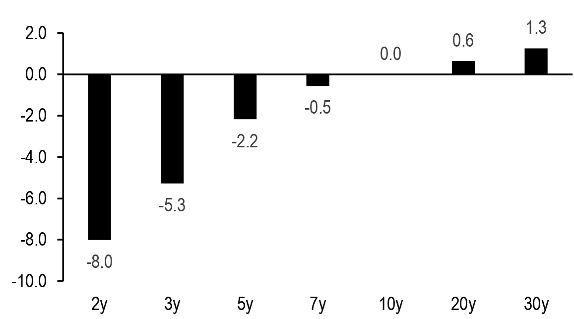 2-year yield (%) 3.91 3.20 Maintain 5s/30s steepeners and 75:6 weighted 5s/10s/30s belly-cheapening butterflies to position for higher term premium