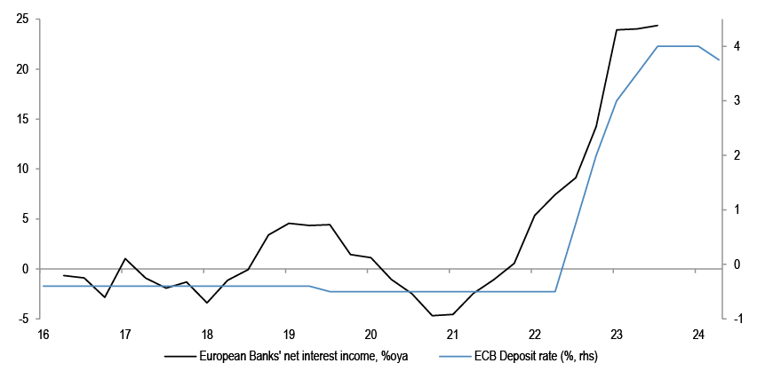 • Bigger picture, CESIs have moved negative recently in a number of key regions, in US, Eurozone, China and Japan. Typically, when CESIs deteriorate, sector leadership is lower beta. Apart from Cyclicals, Financials in particular tended to consistently underperform when CESIs move lower. Banks could also be seeing peaking profits on ECB cuts - bottom chart.