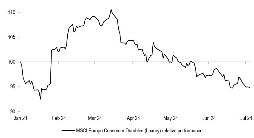 • Luxury (N): Luxury has also underperformed, and we think the sector will continue to struggle on softer pricing. Luxury stocks are still expensive relative to the market and our analysts see few positive catalysts for 2H.