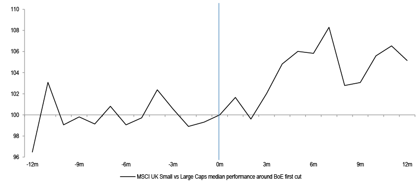 Figure 9: MSCI UK Small vs large cap performance around BoE first cut