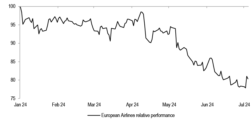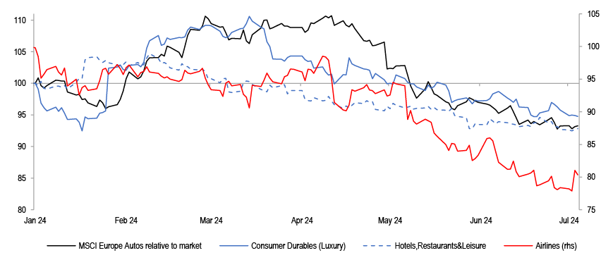 Ytd, European Autos, Airlines, Luxury, Hotels have all performed poorly. The question is whether the weakness in some of these consumer cyclical sectors presents an opportunity for investors? While we have some sympathy in the idea that the European consumer could fare better this year than last, as inflationary pressures ease and policy rates are cut, we believe that the recent underperformance of these stocks could continue, as tailwinds in the form of strong pricing power and elevated margins fade.