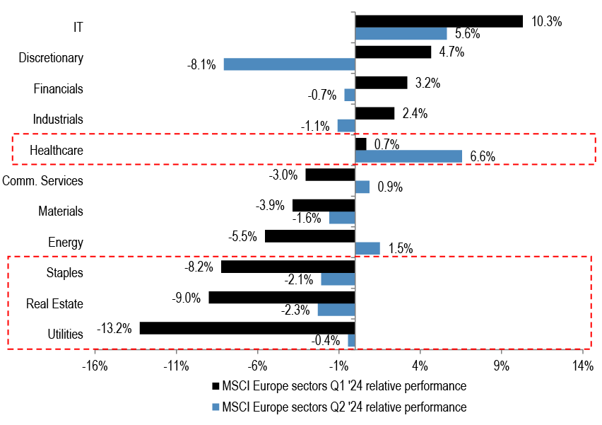 Figure 6: MSCI Europe sectors Q1 ‘24 and Q2 ‘24 relative performance