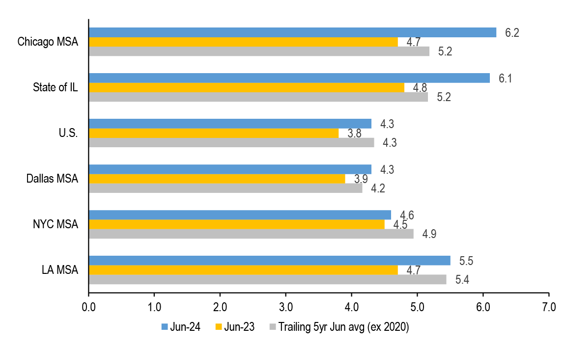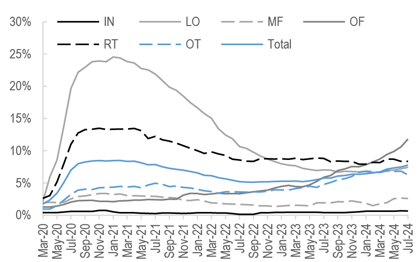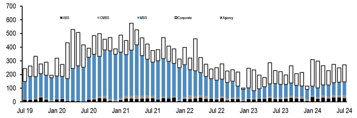 Mortgage rates are roughly unchanged across the stack, with lower coupons modestly tighter. Along with most spread products, valuations have recovered from the local wides seen early in the month; still, with mortgages continuing to offer historically compelling yields vs. corporates, we think the technical support for the product from money managers can be maintained. We continue to prefer UIC conventionals and are underweight 4.5s and 5s. Primary rates have fallen to roughly 6.44% on GSE loans and 5.47% for VA IRRRLs, but we have not seen a surge in refi applications, likely as originators picked up some low hanging fruit earlier this month ( Figure 4, see Mortgages). Mortgage credit spreads similarly retraced much of the widening seen earlier in the month with AAA non-QM back to 130bp in new issue. We expect spreads to remain rangebound over the rest of the year as the macro outlook remains challenging while the election season quickly approaches. Primary activity has been very active this summer, but stepped down over the month from $12bn to $7bn new issue RMBS in August, and we think primary markets will be light in the next week (see RMBS).