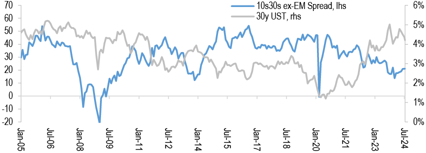 As we look ahead, we continue to forecast 50bp cuts at the September and November meetings followed by 25bp per meeting thereafter. Our forecast is rooted in both the resumption of the disinflationary process which remains broad based across components, together with ongoing loosening in labor markets, which has reduced the risk prices remain sticky. With the beginning of the easing cycle less than a month away and OIS forwards pricing in 103bp of easing through YE24 compared to our own projection of 125bp, this would indicate there is value to being long duration. However we remain patient as growth data has turned more favorable in recent weeks and we do not think the debate surrounding the pace of easing will be settled before the August employment report. Moreover valuations look close to our fair value estimate, and in an environment in which term premium is biased higher, we think it’s unlikely that valuations overshoot to the rich side of fair value. Thus, we remain neutral on duration but continue to favor 5s/30s steepeners as a medium-term expression of our bullish view (see Treasuries).