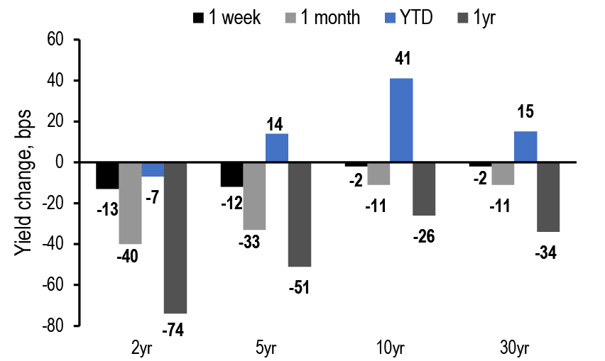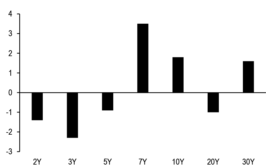 2-year yield (%) 3.91 3.20 Maintain 5s/30s steepeners and 75:6 weighted 5s/10s/30s belly-cheapening butterflies to position for higher term premium