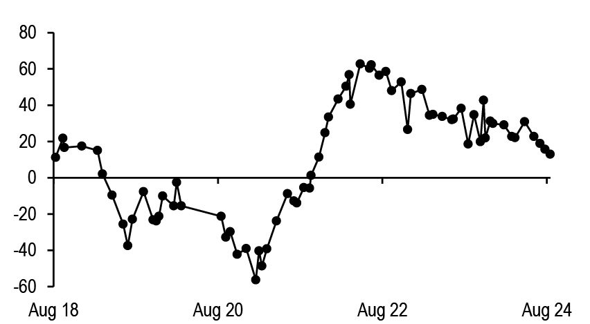 Instead, market participants were focused on Fed communications, which laid the ground work for an upcoming easing cycle. Even before the release of the July payrolls report, the July FOMC minutes revealed that “the vast majority” of the FOMC were ready to cut by the September meeting. Notably “many” participants noted the risks around cutting too little or too late while only “several” thought reducing rates too soon or too much could risk a resurgence in inflation (see July FOMC minutes highlighted labor market risks, Abiel Reinhart). Meanwhile this week Fed speak offered support for a “gradual” or “methodical” pace of cuts. However markets were most keen for Chair Powell’s Friday Jackson Hole speech where his comments skewed dovish. The Chair stated “the time has come” to adjust interest rates and that the Committee does “not seek or welcome further cooling in labor market conditions.” Unsurprisingly, our monetary policy NLP read Powell’s speech as more dovish than his press conference at the July FOMC meeting, and his most dovish speech since the fall of 2021 ( Figure 1, also see Fed, Powell: Review and Outlook, Joseph Lupton, 8/23/24). Whether the FOMC cuts 25bps or 50bps at the September meeting still hinges on the next monthly employment report, though Powell’s comments arguably lower the bar for the Fed to deliver a 50bp cut next month (see Cuts are coming, Michael Feroli, 8/23/24).