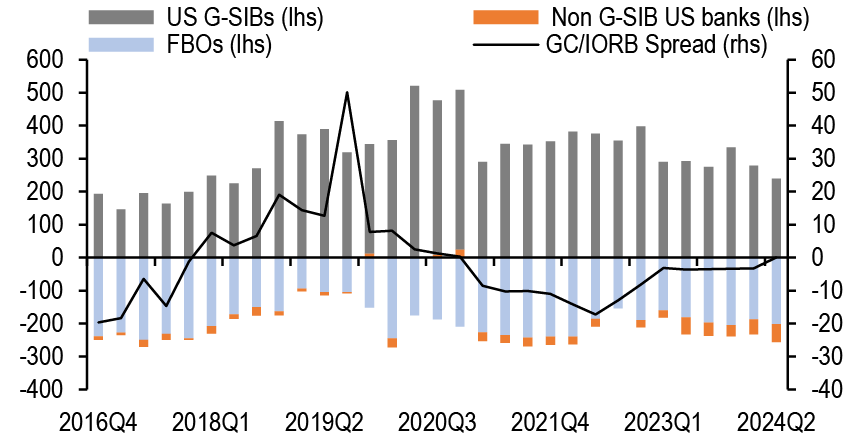 RRP balances have stabilized around $300bn, with limited room to decrease further. Both domestic bank borrowing in the O/N unsecured market and US banks’ participation in the repo market remain minimal, suggesting reserves have not transitioned from abundant to ample yet.