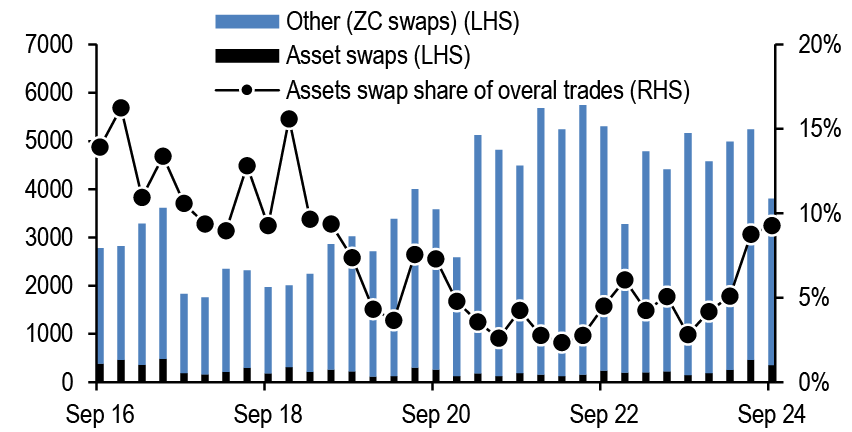 Turning to inflation markets, intermediate breakevens remain cheap to our fair value framework, though the model residual narrowed on Friday, given a dovish shift from Fed Chair Powell. In recent months, the Fed’s wavering confidence in disinflation and thus a heightened focus on labor market data created a less supportive backdrop for TIPS, with real yields demonstrating lower sensitivity to nominal yields in rallies than in sell-offs. However, we argue that the backdrop is becoming more supportive for TIPS once again. Along the curve, the intermediate sector continues to offer value, and forward-starting swaps avoid the negative carry associated with spot breakeven positions. With the fundamental backdrop turning more supportive and valuations still cheap, albeit somewhat less cheap than a week ago, we maintain tactical long exposure in 5Yx5Y inflation swaps (see TIPS).