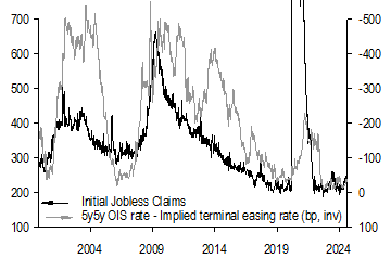 • Economics: The preliminary benchmark payroll revisions lowered total payroll growth for the year through March 2024 by 818k. Initial claims remained relatively unchanged at 232k for the August employment report reference week