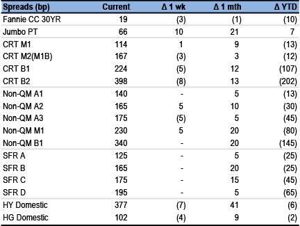 CRT M1B/M2 (DM@10CPR) 1MS + 168bp 1MS + 175bp Non-QM and jumbo spreads have moved tighter vs. pre-August rate volatility, and we expect rangebound spreads through year end.