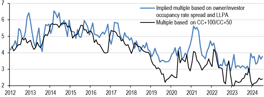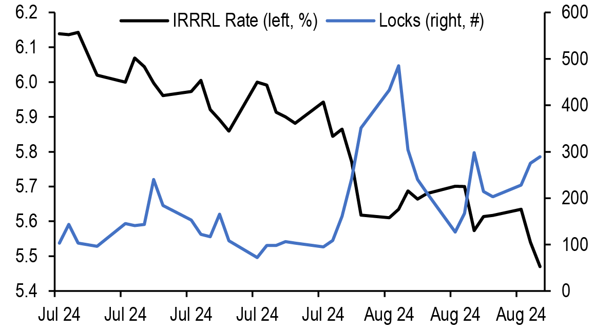 Mortgage rates are roughly unchanged across the stack, with lower coupons modestly tighter. Along with most spread products, valuations have recovered from the local wides seen early in the month; still, with mortgages continuing to offer historically compelling yields vs. corporates, we think the technical support for the product from money managers can be maintained. We continue to prefer UIC conventionals and are underweight 4.5s and 5s. Primary rates have fallen to roughly 6.44% on GSE loans and 5.47% for VA IRRRLs, but we have not seen a surge in refi applications, likely as originators picked up some low hanging fruit earlier this month ( Figure 4, see Mortgages). Mortgage credit spreads similarly retraced much of the widening seen earlier in the month with AAA non-QM back to 130bp in new issue. We expect spreads to remain rangebound over the rest of the year as the macro outlook remains challenging while the election season quickly approaches. Primary activity has been very active this summer, but stepped down over the month from $12bn to $7bn new issue RMBS in August, and we think primary markets will be light in the next week (see RMBS).