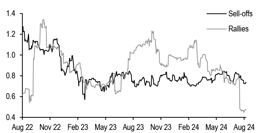 Despite the near certainty of a cut in September, the pace and extent of easing remain uncertain with OIS markets placing significant weight on both deep cut and shallow cut scenarios. In this period of elevated policy uncertainty, yields should remain highly sensitive to both new economic and policy information; Figure 2 shows the percentile moves in yields around Fedspeak events and indicates that markets are prone to greater sensitivity during periods of elevated policy uncertainty. Such a backdrop is conducive to jump risk and supportive of elevated realized volatility. Thus with significant jump risk going into August payrolls and beyond, we remain bullish on volatility in short expiries. We also remain positioned for a flattening in the swap spread curve. Front-end spreads should be biased wider as SOFR and GC rates normalize and net T-bill supply turns negative in September whereas long-end spreads should narrow against the backdrop of rising term premium. Therefore, we now recommend initiating exposure to a flatter 5s/30s swap spread curve (see Interest rate derivatives).